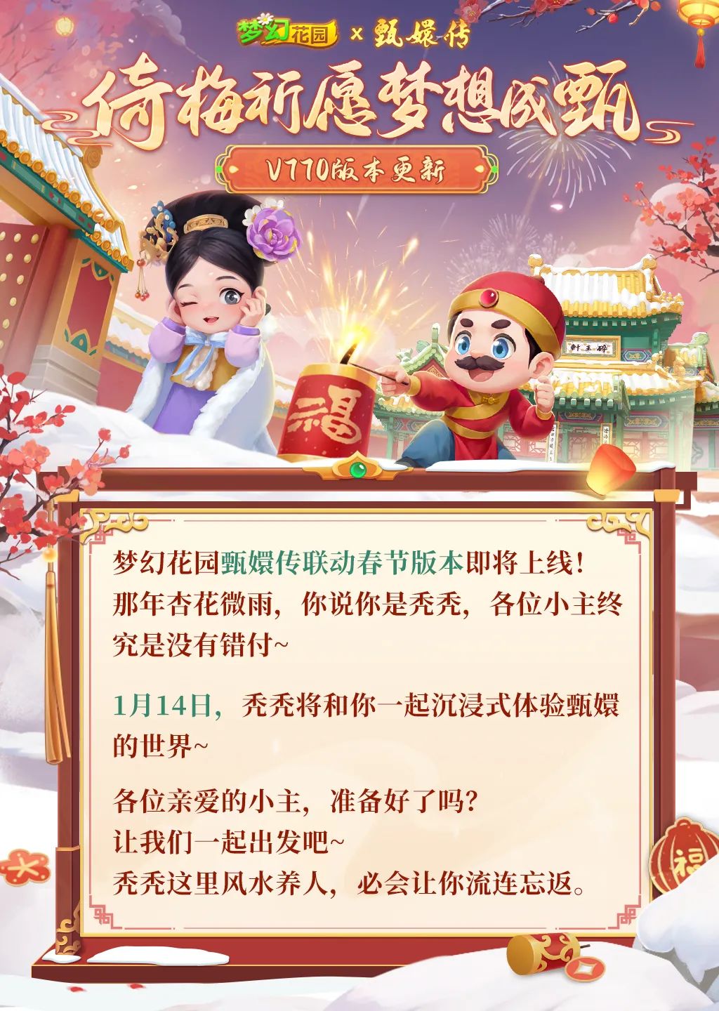 秃秃的福气来啦,和大家心心念念的《甄嬛传》联动上了,从1月14日至3月3日,玩家们将沉浸在一个融合了经典剧情与现代游戏乐趣的世界中,体验前所未有的梦幻花园。“嬛嬛一袅”新皮肤,“红梅春信”收集新道具,“大橘四郎”和“三花宛宛”全新宠物,甄嬛PK赛—寻诗芳录……众多精彩和福利等待玩家解锁,新的一年,大家一起倚梅祈愿,梦想成甄!快来看看秃秃与嬛嬛将碰撞出什么样的火花吧!